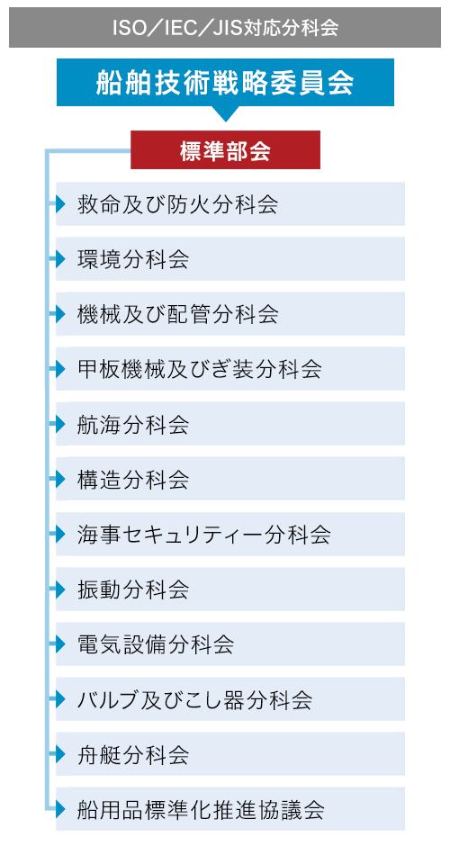 | 本協会は、ISO、IECにおける船舶分野の国内審議団体として、国際標準化の審議に参画し、国際規格原案の提案、審議を行っています。 このため、船舶技術戦略委員会のもとに標準部会を設置し、さらに分野別に、11の分科会と1の協議会を設置して対応しています。 |